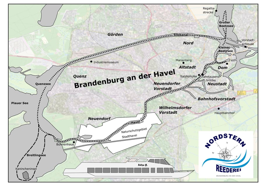 2,5 stündige Schifffahrt auf der Havel und Ihren Seen rund um Brandenburg mit der Umfahrung der Kanincheninsel auf dem Breitlingsee: